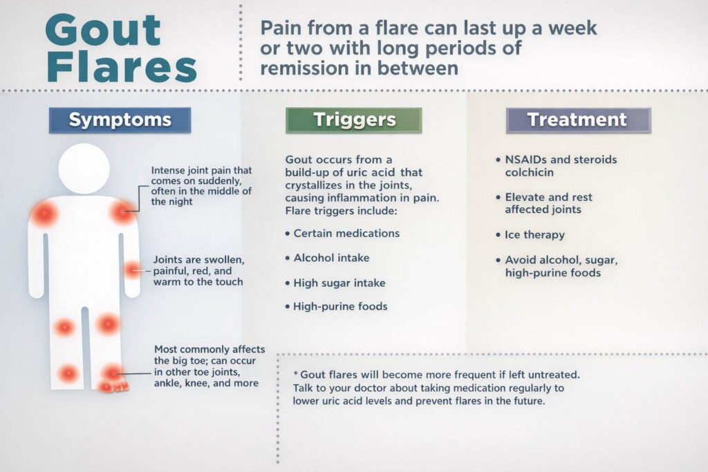 A gout flare occurs when urate crystals trigger intense inflammation in a joint. Even between attacks, crystals can remain and silently irritate tissue if uric acid stays high. That’s why long-term prevention focuses on maintaining serum urate below the level where crystals continue to form.