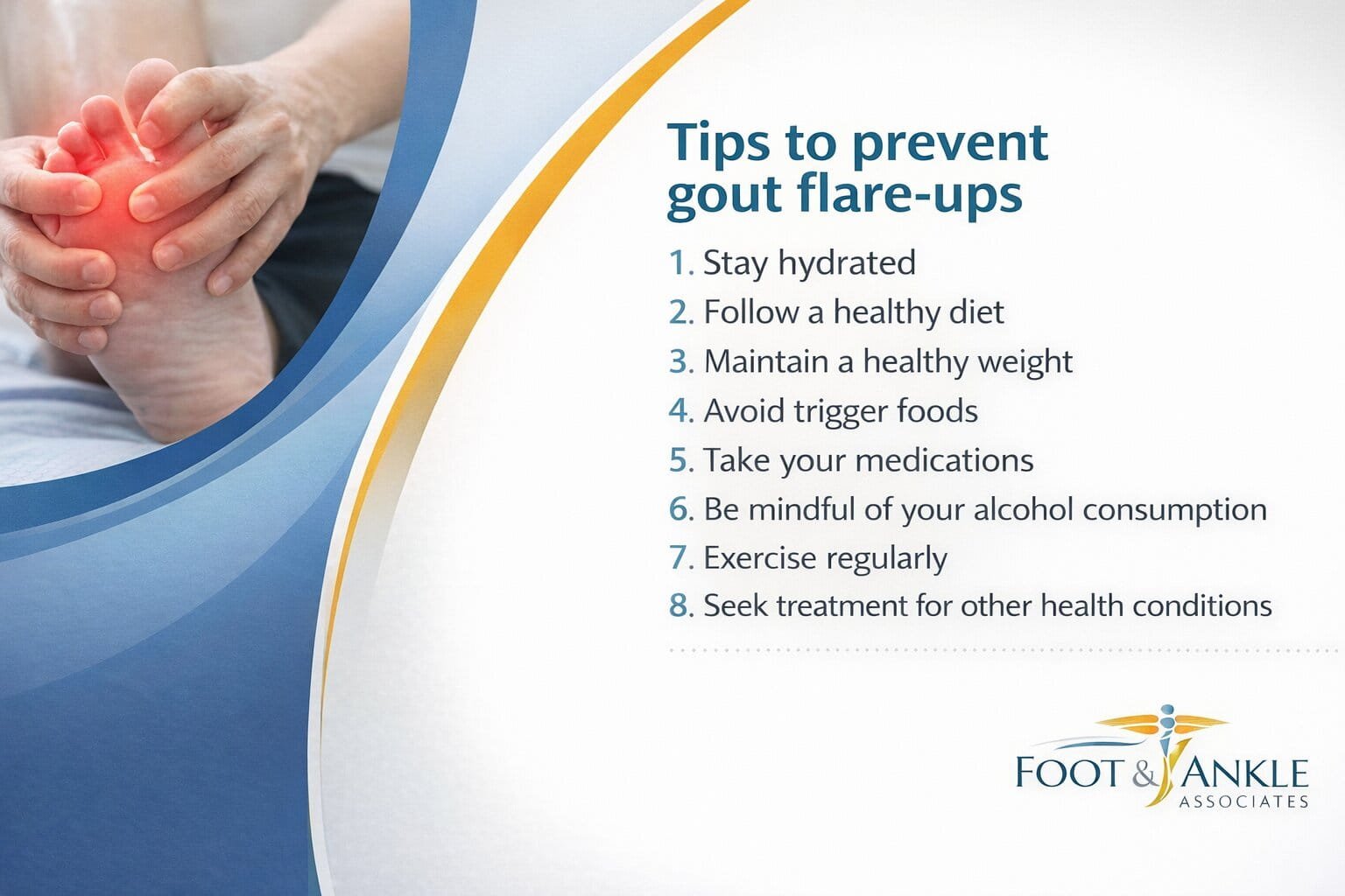 Avoid crash diets. Rapid weight loss, fasting extremes, and dehydration can worsen urate and trigger flares. Aim for slow, steady progress.